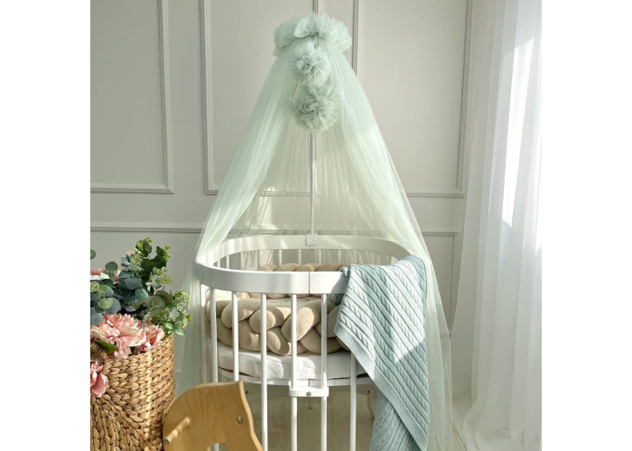 Выполнен из тоненькой шестигранной легкой сеточки. Технология связки разработана специалистами в области детских товаров. Благодаря такому подходу, балдахин прекрасно пропускает воздух, оберегая сон малыша от насекомых и ветра. Достаточная прозрачность позволяет наблюдать ребенка. Благодаря легкой ткани создается особенная нежная атмосфера детской комнаты.