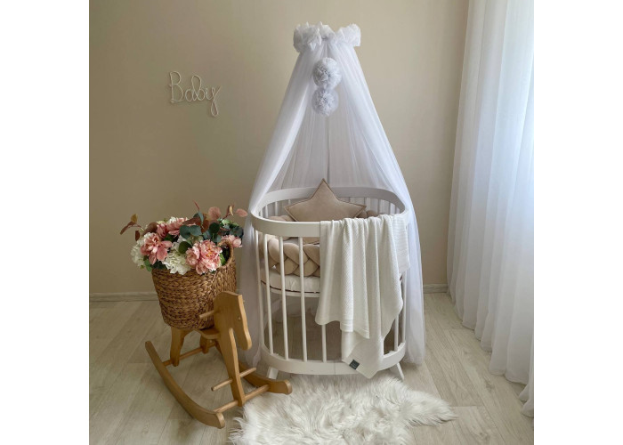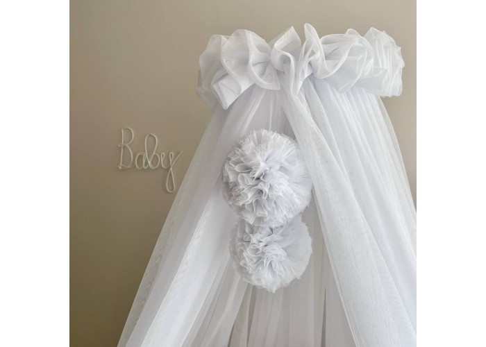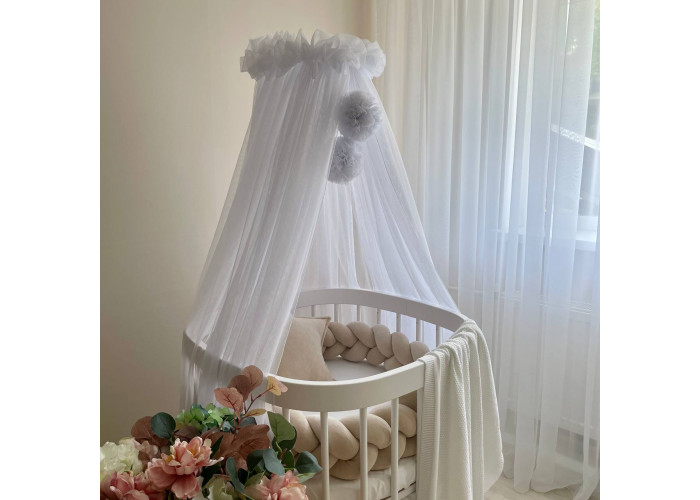 Выполнен из тоненькой шестигранной легкой сеточки. Технология связки разработана специалистами в области детских товаров. Благодаря такому подходу, балдахин прекрасно пропускает воздух, оберегая сон малыша от насекомых и ветра. Достаточная прозрачность позволяет наблюдать ребенка. Благодаря легкой ткани создается особенная нежная атмосфера детской комнаты.