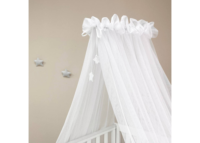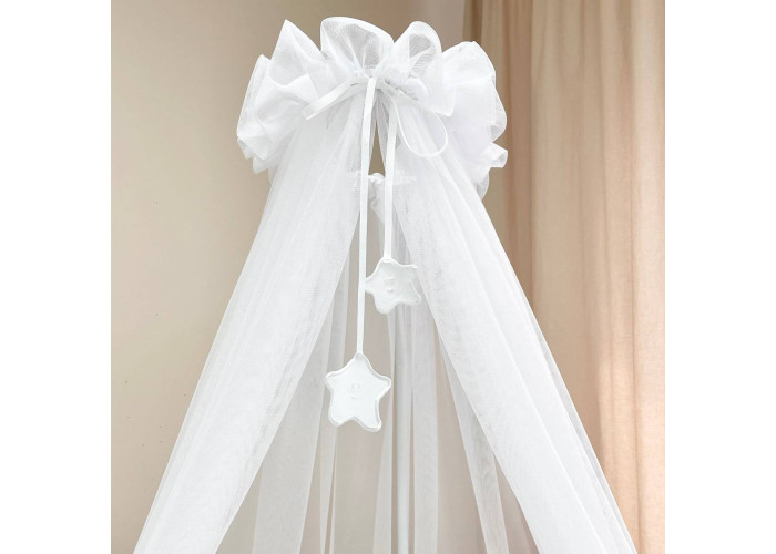 Выполнен из тоненькой шестигранной легкой сеточки. Технология связки разработана специалистами в области детских товаров. Благодаря такому подходу, балдахин прекрасно пропускает воздух, оберегая сон малыша от насекомых и ветра. Достаточная прозрачность позволяет наблюдать ребенка. Благодаря легкой ткани создается особенная нежная атмосфера детской комнаты.