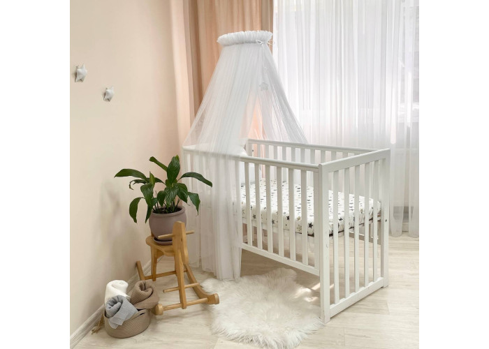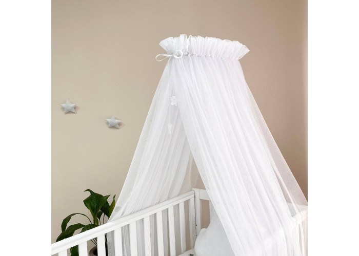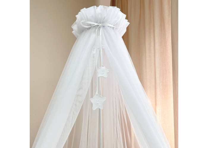 Выполнен из тоненькой шестигранной легкой сеточки. Технология связки разработана специалистами в области детских товаров. Благодаря такому подходу, балдахин прекрасно пропускает воздух, оберегая сон малыша от насекомых и ветра. Достаточная прозрачность позволяет наблюдать ребенка. Благодаря легкой ткани создается особенная нежная атмосфера детской комнаты.