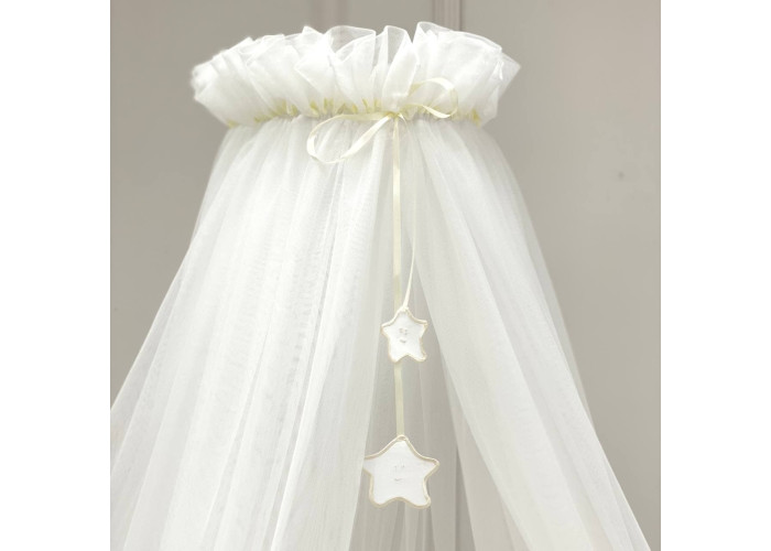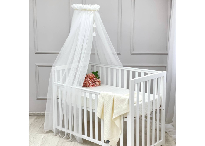 Выполнен из тоненькой шестигранной легкой сеточки. Технология связки разработана специалистами в области детских товаров. Благодаря такому подходу, балдахин прекрасно пропускает воздух, оберегая сон малыша от насекомых и ветра. Достаточная прозрачность позволяет наблюдать ребенка. Благодаря легкой ткани создается особенная нежная атмосфера детской комнаты.