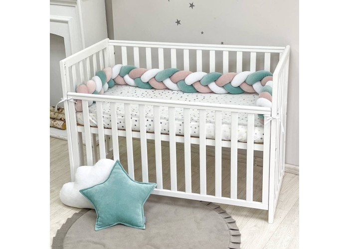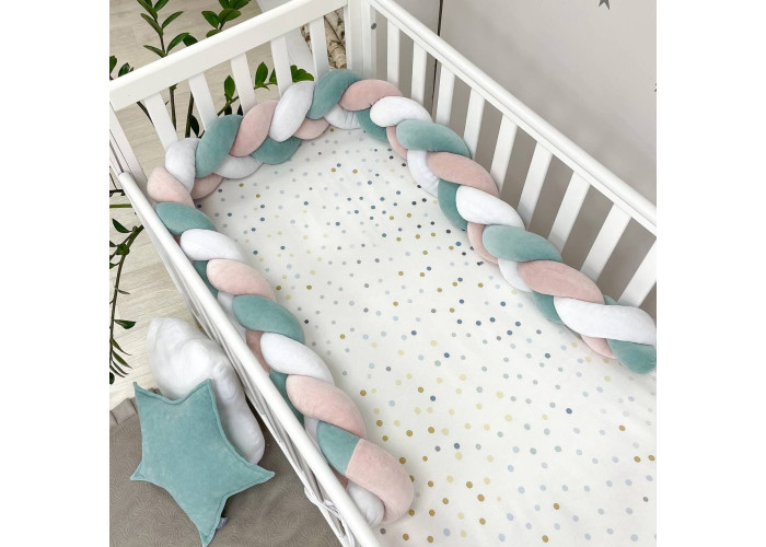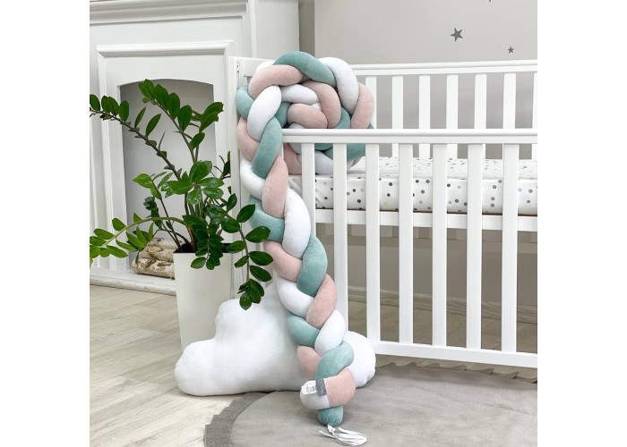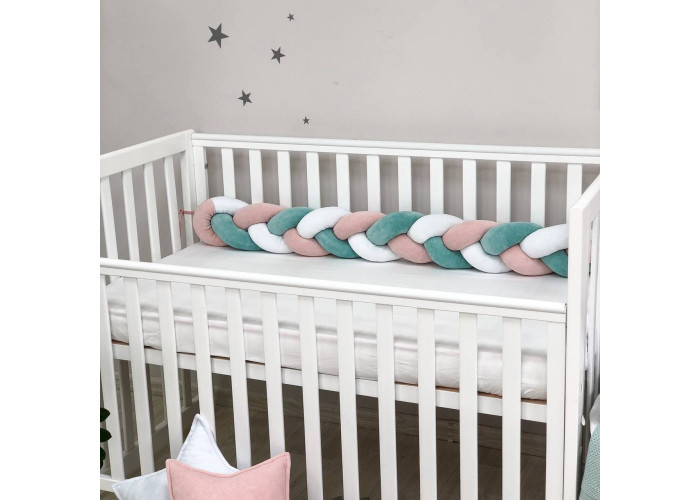Бортик-коса- стильная, мягкая, приятная на ощупь защита, не ограничивает доступ воздуха в кроватку, удобна, не занимает много места. Подходит для прямоугольных, овальных и круглых кроваток. Когда ребенок подрастает, незаменим для игр и для декора детской комнаты. До рождения малыша, можно использовать как удобную подушку для беременной мамы.