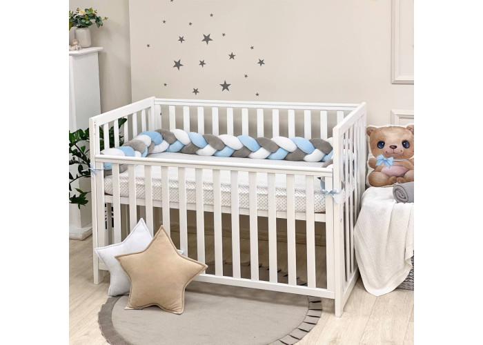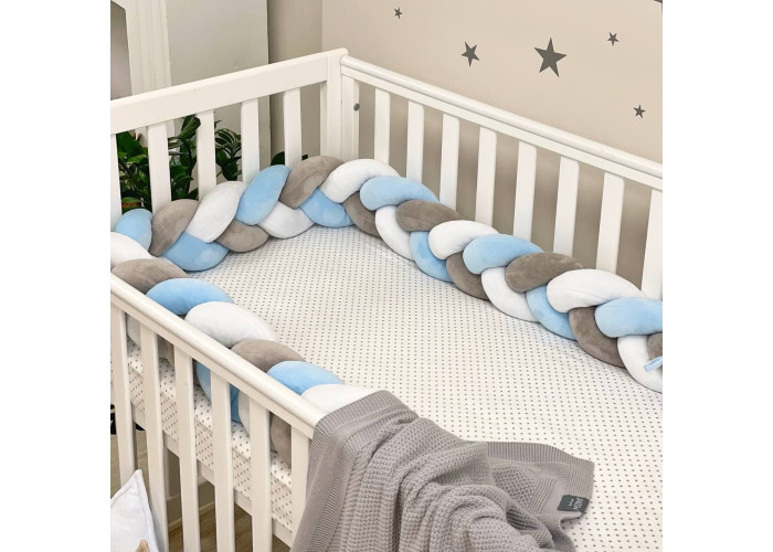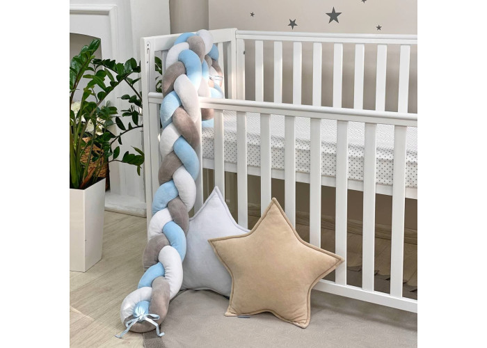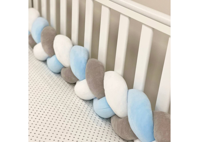 Бортик-коса- стильная, мягкая, приятная на ощупь защита, не ограничивает доступ воздуха в кроватку, удобна, не занимает много места. Подходит для прямоугольных, овальных и круглых кроваток. Когда ребенок подрастает, незаменим для игр и для декора детской комнаты. До рождения малыша, можно использовать как удобную подушку для беременной мамы.