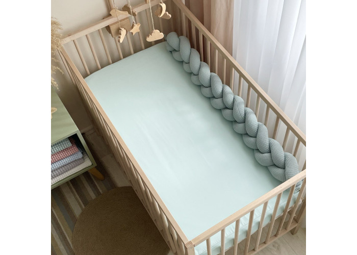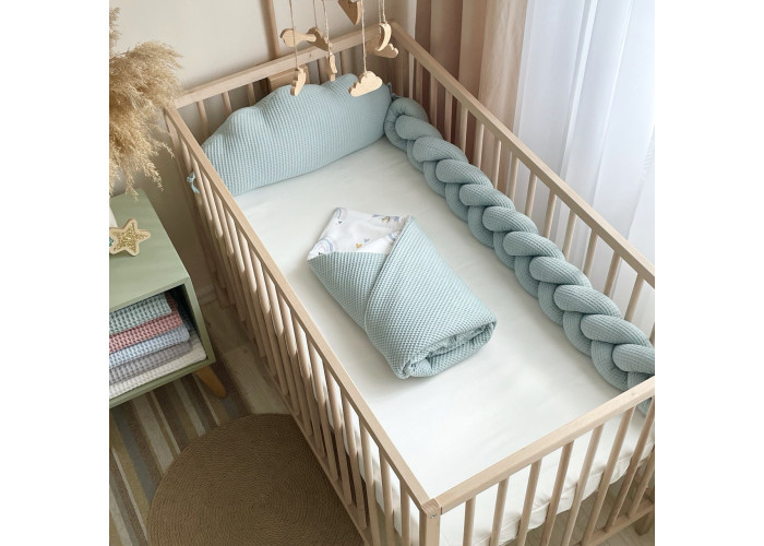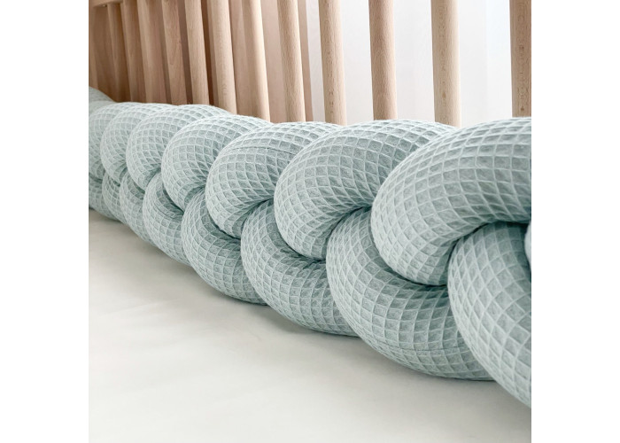 Бортик-коса из вафельной ткани - стильная, уникальная своей структурой, мягкая, приятная на ощупь защита, не ограничивает доступ воздуха в кроватку, удобна, не занимает много места. Когда ребенок подрастает, незаменим для игр и для декора детской комнаты. До рождения малыша, можно использовать как удобную подушку для беременной мамы.