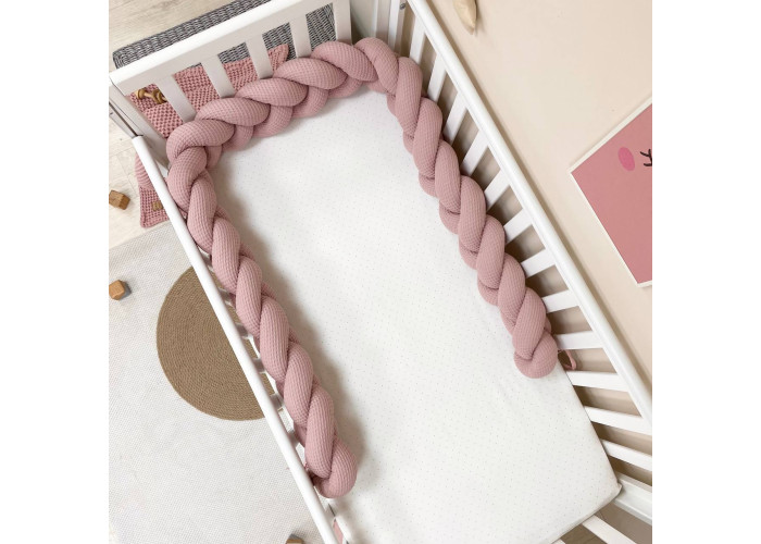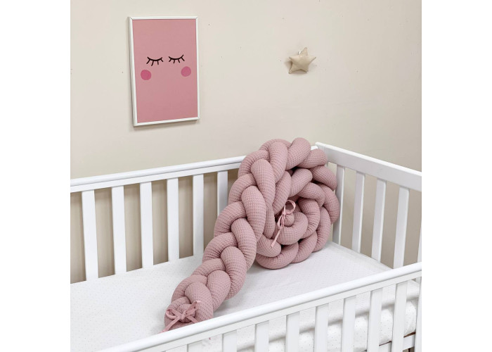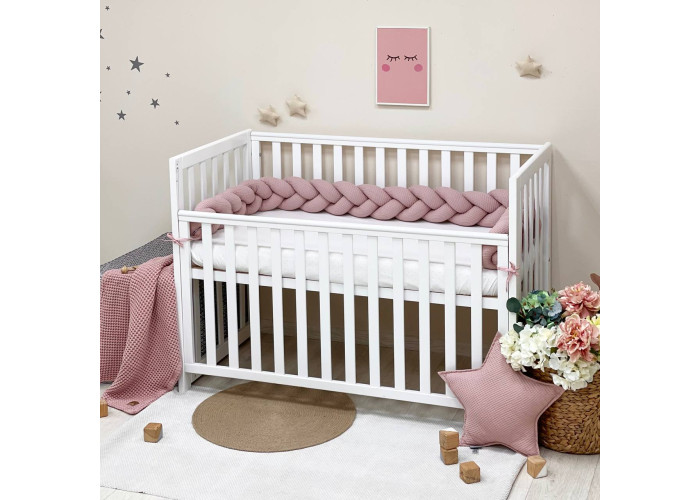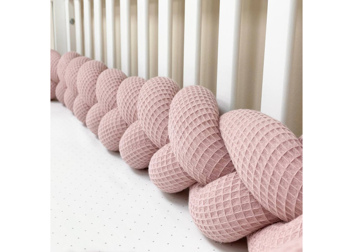 Бортик-коса из вафельной ткани - стильная, уникальная своей структурой, мягкая, приятная на ощупь защита, не ограничивает доступ воздуха в кроватку, удобна, не занимает много места. Когда ребенок подрастает, незаменим для игр и для декора детской комнаты. До рождения малыша, можно использовать как удобную подушку для беременной мамы.