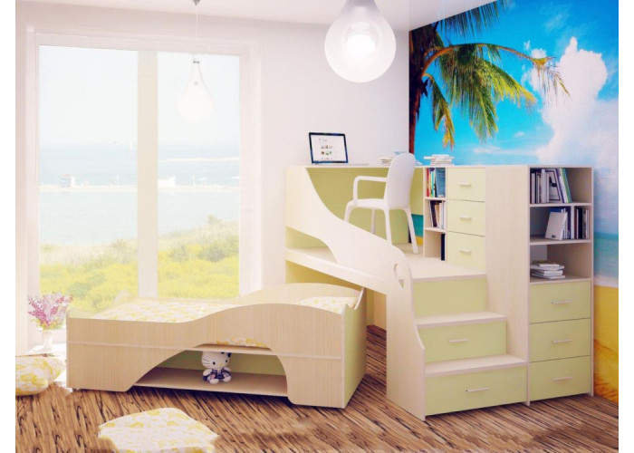 Внизу ниша , в которую удобно спрятать кровать в дневное время для максимально функционального использования пространства детской комнате.