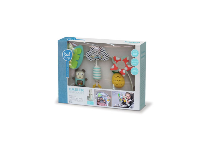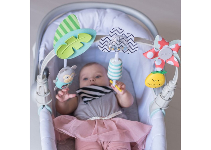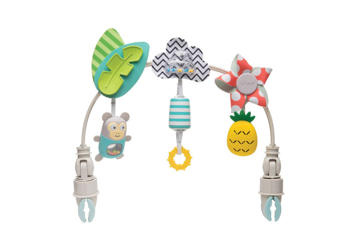 Гнучка дуга для коляски "Тропічний оркестр" - це три іграшки, які занурять малюка в гармонію тропіків, де бігають веселі мавпочки, світить сонечко і ростуть ананаси.