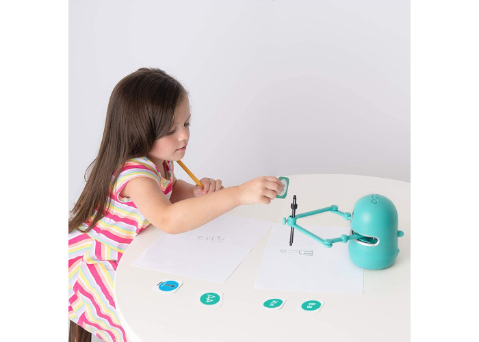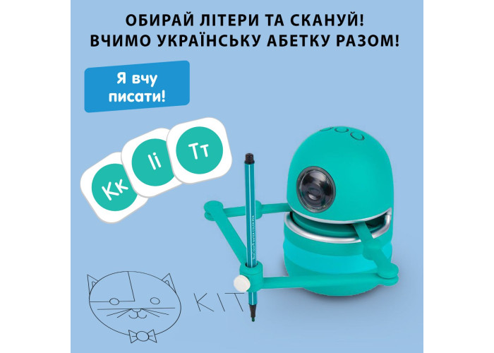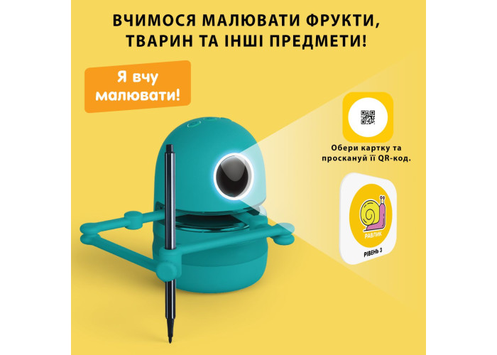 2. Квінсі вчить писати по літерах: після того, як робот з дитиною закінчить малювати певний предмет, Квінсі запропонує написати його назву. Далі дитині потрібно буде відібрати картки з літерами, з яких складається це слово. Проскануйте QR-код кожної літери слова - робот називатиме їх по черзі та зрозуміє, вірну відповідь дала дитина чи ні. Таким чином, дитина може вивчити українську абетку разом з Квінсі!