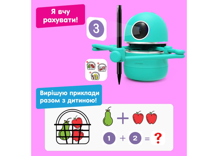 3. Квінсі вчить рахувати за допомогою математичних карток: до набору входить чотири математичні картки із захопливими історіями. Під час того, як робот буде малювати зображення до завдань, він буде розповідати багато цікавих фактів, а також запропонує вирішити декілька прикладів з дитиною. Для того, щоб дати відповідь, проскануйте картку з цифрою. Робот розуміє, вірна відповідь чи ні.