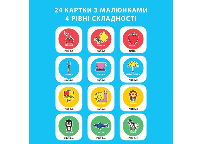 Існує чотири рівні складності карток з малюнками, які розділені за темами. Рекомендуємо дотримуватися послідовності від 1 до 4 рівня.