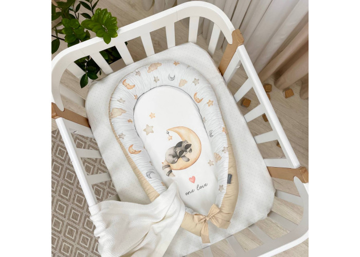 Гнездышко-кокон-это небольшой, эргономичный, плоский матрас с мягкими ограничительными бортиками по всему периметру высотой 10 см. Наполнитель матраса - пена, упругий, современный, модифицированный материал, равномерно распределяющий нагрузку, благодаря чему малыш и удобно. Чехол матраса сшит из микрофибры. Наполнитель для бортиков – силиконизированное волокно. Бортики можно стянуть специальной нитью, которая уже вшита в кокон и зафиксировать бантом, таким образом можно уменьшать или увеличивать размер кокона-гнездышка. Ткань чехла - натуральный 100% хлопок поплин.