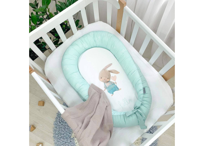 Гнездышко-кокон-это небольшой, эргономичный, плоский матрас с мягкими ограничительными бортиками по всему периметру высотой 10 см. Наполнитель матраса - пена, упругий, современный, модифицированный материал, равномерно распределяющий нагрузку, благодаря чему малыш и удобно. Чехол матраса сшит из микрофибры. Наполнитель для бортиков – силиконизированное волокно. Бортики можно стянуть специальной нитью, которая уже вшита в кокон и зафиксировать бантом, таким образом можно уменьшать или увеличивать размер кокона-гнездышка. Ткань чехла - натуральный 100% хлопок поплин.