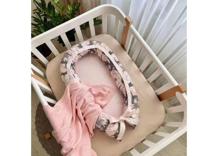 Гнездышко-кокон-это небольшой, эргономичный, плоский матрас с мягкими ограничительными бортиками по всему периметру высотой 10 см. Наполнитель матраса - пена, упругий, современный, модифицированный материал, равномерно распределяющий нагрузку, благодаря чему малыш и удобно. Чехол матраса сшит из микрофибры. Наполнитель для бортиков – силиконизированное волокно. Бортики можно стянуть специальной нитью, которая уже вшита в кокон и зафиксировать бантом, таким образом можно уменьшать или увеличивать размер кокона-гнездышка. Ткань чехла - сатин.