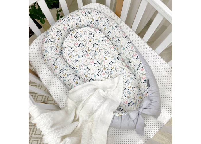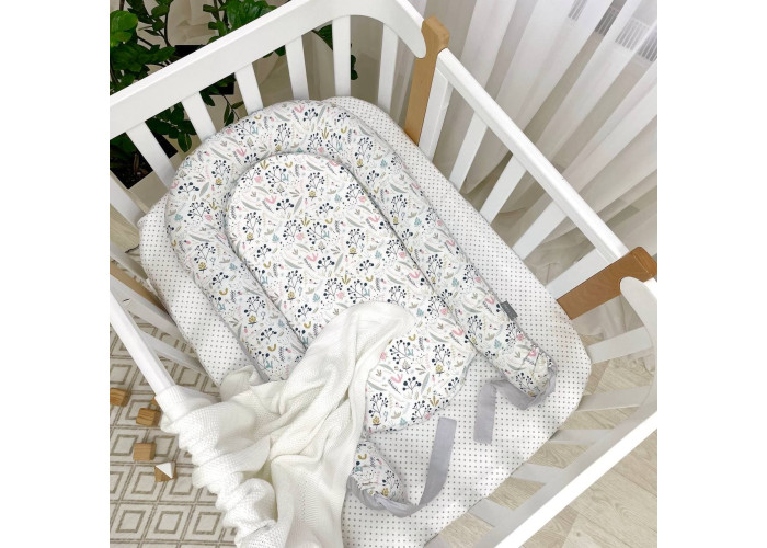 Гнездышко-кокон-это небольшой, эргономичный, плоский матрас с мягкими ограничительными бортиками по всему периметру высотой 10 см. Наполнитель матраса - пена, упругий, современный, модифицированный материал, равномерно распределяющий нагрузку, благодаря чему малыш и удобно. Чехол матраса сшит из микрофибры. Наполнитель для бортиков – силиконизированное волокно. Бортики можно стянуть специальной нитью, которая уже вшита в кокон и зафиксировать бантом, таким образом можно уменьшать или увеличивать размер кокона-гнездышка. Ткань чехла - сатин.