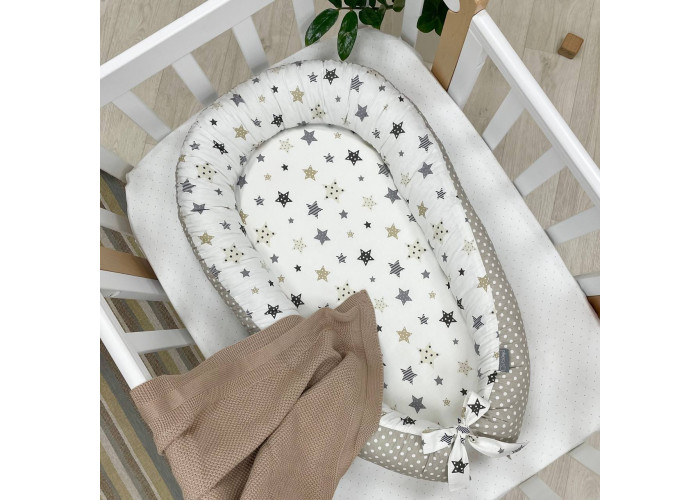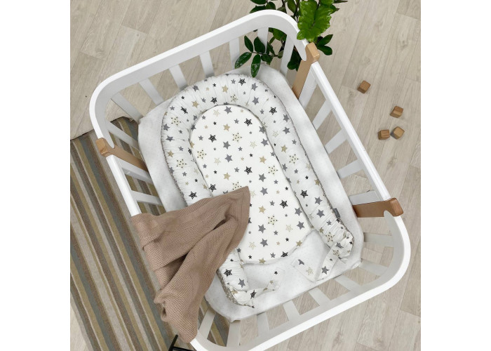 Гнездышко-кокон-это небольшой, эргономичный, плоский матрас с мягкими ограничительными бортиками по всему периметру высотой 10 см. Наполнитель матраса - пена, упругий, современный, модифицированный материал, равномерно распределяющий нагрузку, благодаря чему малыш и удобно. Чехол матраса сшит из микрофибры. Наполнитель для бортиков – силиконизированное волокно. Бортики можно стянуть специальной нитью, которая уже вшита в кокон и зафиксировать бантом, таким образом можно уменьшать или увеличивать размер кокона-гнездышка. Ткань чехла - сатин.