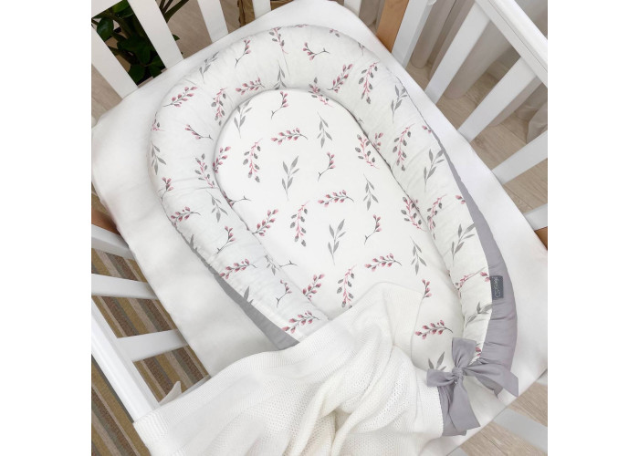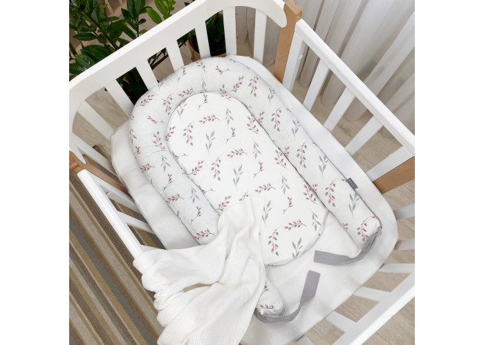 Гнездышко-кокон-это небольшой, эргономичный, плоский матрас с мягкими ограничительными бортиками по всему периметру высотой 10 см. Наполнитель матраса - пена, упругий, современный, модифицированный материал, равномерно распределяющий нагрузку, благодаря чему малыш и удобно. Чехол матраса сшит из микрофибры. Наполнитель для бортиков – силиконизированное волокно. Бортики можно стянуть специальной нитью, которая уже вшита в кокон и зафиксировать бантом, таким образом можно уменьшать или увеличивать размер кокона-гнездышка. Ткань чехла - сатин.