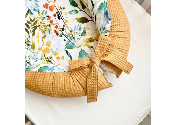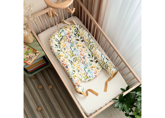 Гнездышко-кокон-это небольшой, эргономичный, плоский матрас с мягкими ограничительными бортиками по всему периметру высотой 10 см. Наполнитель матраса - пена, упругий, современный, модифицированный материал, равномерно распределяющий нагрузку, благодаря чему малыш и удобно. Чехол матраса сшит из микрофибры. Наполнитель для бортиков – силиконизированное волокно. Бортики можно стянуть специальной нитью, которая уже вшита в кокон и зафиксировать бантом, таким образом можно уменьшать или увеличивать размер кокона-гнездышка. Ткань чехла - натуральный 100% хлопок поплин.