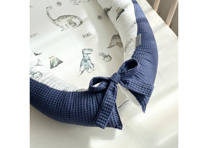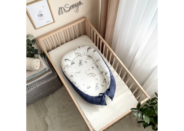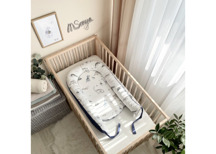 Гнездышко-кокон-это небольшой, эргономичный, плоский матрас с мягкими ограничительными бортиками по всему периметру высотой 10 см. Наполнитель матраса - пена, упругий, современный, модифицированный материал, равномерно распределяющий нагрузку, благодаря чему малыш и удобно. Чехол матраса сшит из микрофибры. Наполнитель для бортиков – силиконизированное волокно. Бортики можно стянуть специальной нитью, которая уже вшита в кокон и зафиксировать бантом, таким образом можно уменьшать или увеличивать размер кокона-гнездышка. Ткань чехла - натуральный 100% хлопок поплин.