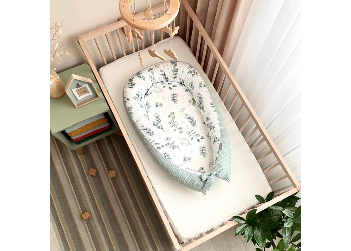 Гнездышко-кокон-это небольшой, эргономичный, плоский матрас с мягкими ограничительными бортиками по всему периметру высотой 10 см. Наполнитель матраса - пена, упругий, современный, модифицированный материал, равномерно распределяющий нагрузку, благодаря чему малыш и удобно. Чехол матраса сшит из микрофибры. Наполнитель для бортиков – силиконизированное волокно. Бортики можно стянуть специальной нитью, которая уже вшита в кокон и зафиксировать бантом, таким образом можно уменьшать или увеличивать размер кокона-гнездышка. Ткань чехла - натуральный 100% хлопок поплин.