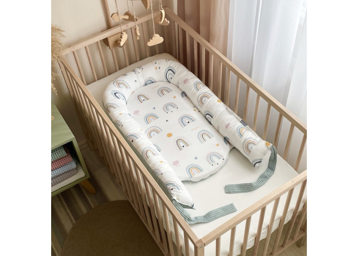 Гнездышко-кокон-это небольшой, эргономичный, плоский матрас с мягкими ограничительными бортиками по всему периметру высотой 10 см. Наполнитель матраса - пена, упругий, современный, модифицированный материал, равномерно распределяющий нагрузку, благодаря чему малыш и удобно. Чехол матраса сшит из микрофибры. Наполнитель для бортиков – силиконизированное волокно. Бортики можно стянуть специальной нитью, которая уже вшита в кокон и зафиксировать бантом, таким образом можно уменьшать или увеличивать размер кокона-гнездышка. Ткань чехла - натуральный 100% хлопок поплин.