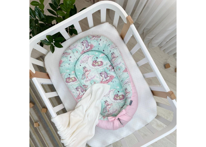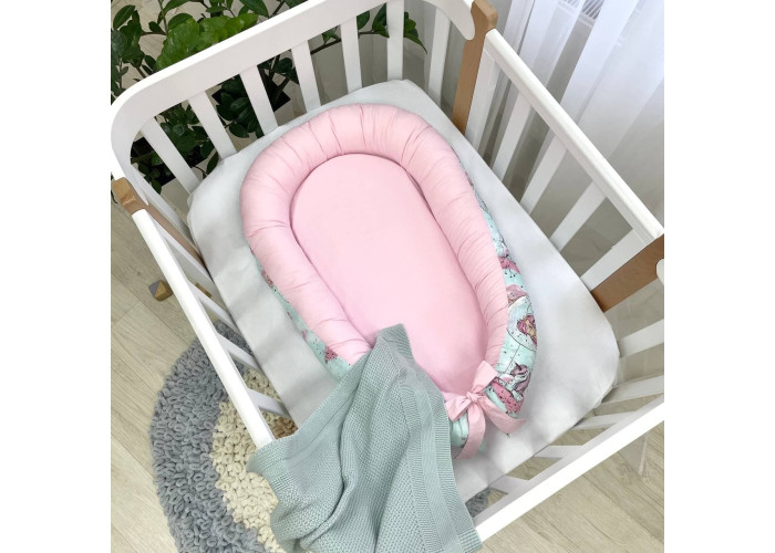 Гнездышко-кокон-это небольшой, эргономичный, плоский матрас с мягкими ограничительными бортиками по всему периметру высотой 10 см. Наполнитель матраса - пена, упругий, современный, модифицированный материал, равномерно распределяющий нагрузку, благодаря чему малыш и удобно. Чехол матраса сшит из микрофибры. Наполнитель для бортиков – силиконизированное волокно. Бортики можно стянуть специальной нитью, которая уже вшита в кокон и зафиксировать бантом, таким образом можно уменьшать или увеличивать размер кокона-гнездышка. Ткань чехла - сатин.