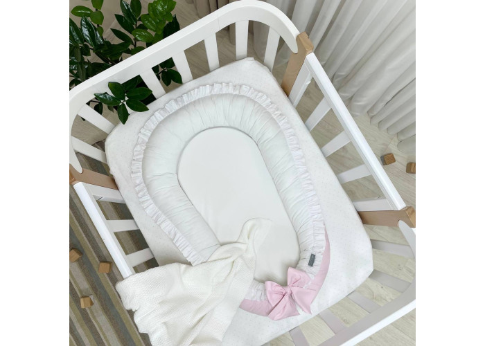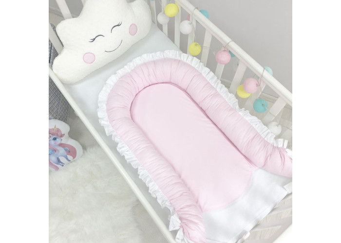 Гнездышко-кокон-это небольшой, эргономичный, плоский матрас с мягкими ограничительными бортиками по всему периметру высотой 10 см. Наполнитель матраса - пена, упругий, современный, модифицированный материал, равномерно распределяющий нагрузку, благодаря чему малыш и удобно. Чехол матраса сшит из микрофибры. Наполнитель для бортиков – силиконизированное волокно. Бортики можно стянуть специальной нитью, которая уже вшита в кокон и зафиксировать бантом, таким образом можно уменьшать или увеличивать размер кокона-гнездышка. Ткань чехла - сатин.