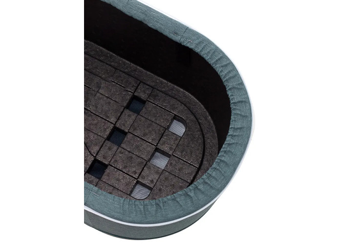 Регулируемый наклон основания люльки позволяет перевести ребенка в полусидячее положение. Дно люльки оснащено системой вентиляции для регулировки поступления воздуха и температуры внутри люльки. Капюшон выполнен из ткани с отделкой, защищает от УФ-излучения (UPF 50+), и оснащен дополнительным козырьком и вентиляционным окошко на молнии.
