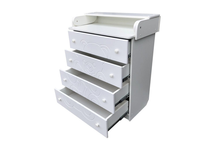 Пеленальный комод Baby Comfort Teddy на 4 ящика - это отличное решение для молодых родителей в уходе за малышом и организации места хранения вещей крохи. Комод изготовлен в современном белом цвете из плит ДСП высокого качества. Комод укомплектован пеленальным столиком, на котором очень удобно будет переодевать малыша, делать массажи или просто играться, ведь высота позволяет уменьшить нагрузку на спину мамы. Так же, в комплектации 4 выдвижных ящика на телескопических направляющих, куда можно сложить самые необходимы вещи крохи.