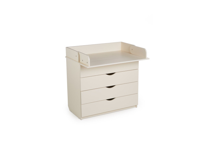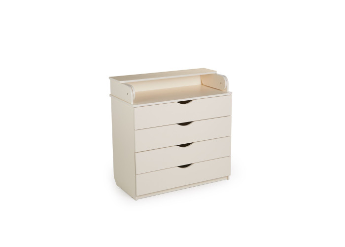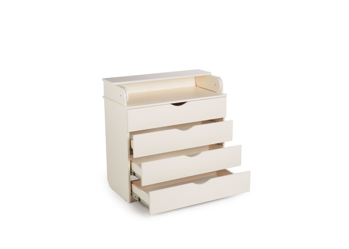 Детские вещи и косметика всегда под рукой, благодаря 4 вместительным ящикам. Верхняя часть комода легко откидывается и превращается в удобный пеленальный столик, который при необходимости снимается. А скругленные бортики позволят безопасно переодеть малыша. Комод изготовлен из натуральных материалов и качественного ламинированного дсп