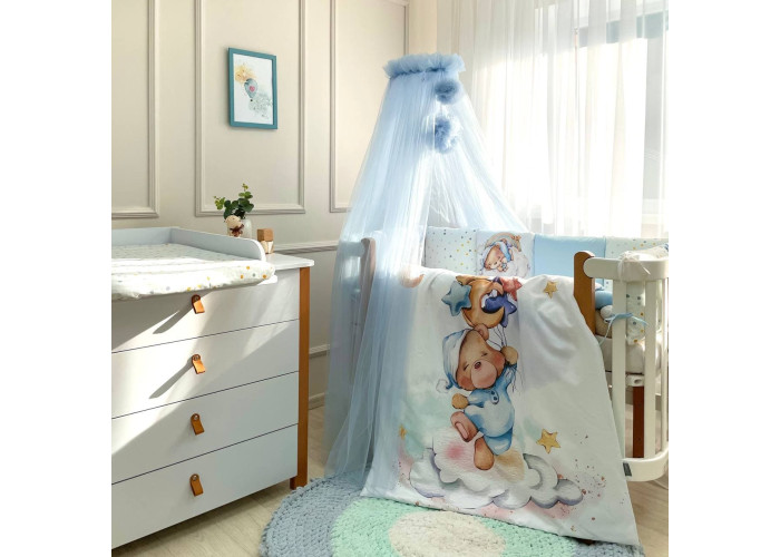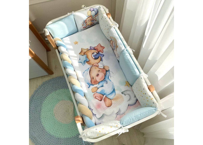 Комплект постельного белья из 6 предметов (бортики, одеяло, подушка, пододеяльник, наволочка, простыня), 100% хлопок.