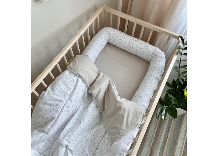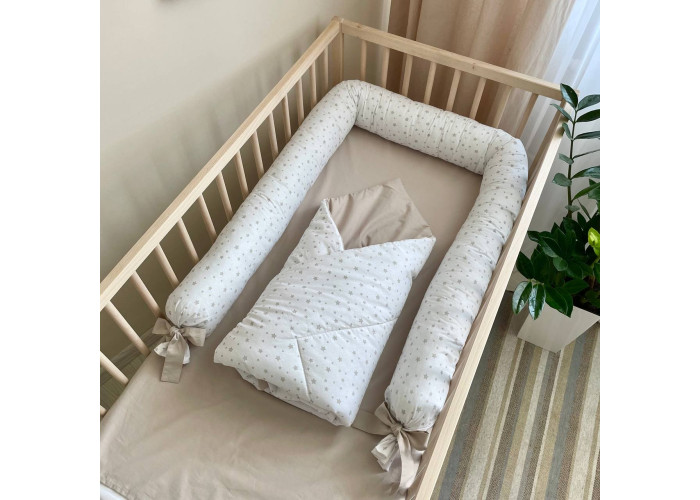 Этот комплект можно использовать в нескольких вариантах. Если сформировать из валика защитное кольцо, сверху положить простыню, покрыв малыша одеялом, получится уютное спальное место. Также валик можно использовать в качестве защитного бортика в кроватку. Плед-конверт подойдет для использования в коляске, во время прогулок или в автомобиле. Комплект удобно брать в поездку, потому что он не занимает много места.