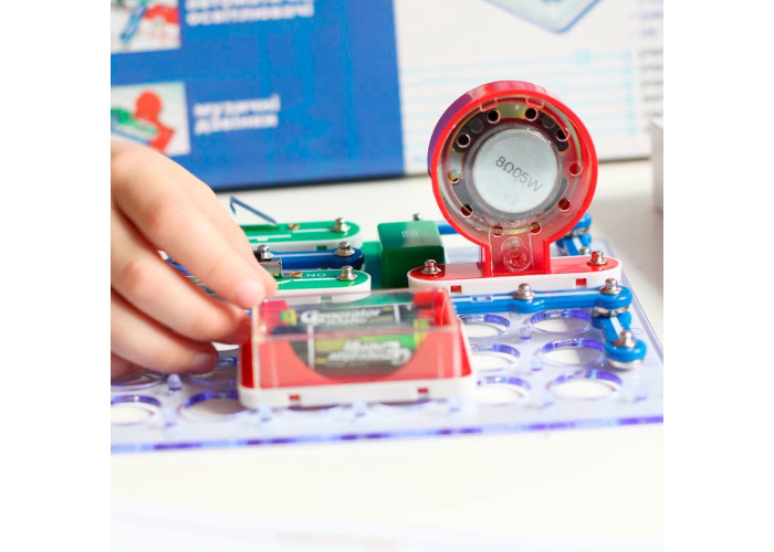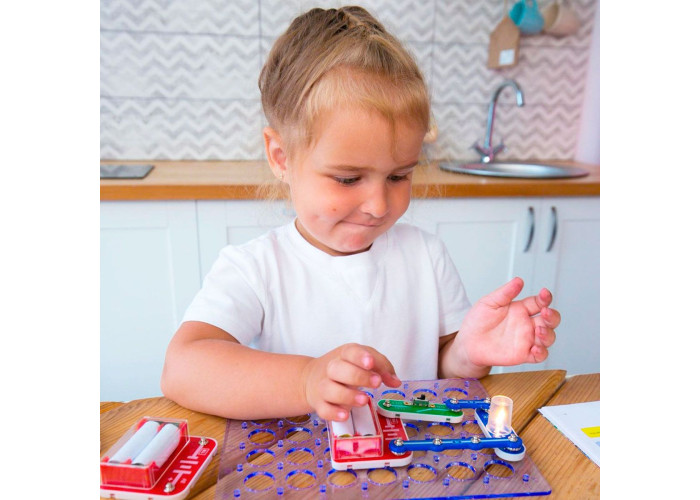 Конструктор дозволяє дитині своїми руками створювати світлові і звукові сигналізації, ліхтарик з трьома режимами, допоможе в знайомстві з логічними елементами, вивченні транзистора, регулюванні яскравості і гучності. Завдяки оригінальному способу з'єднання деталей Ви зможете домогтися швидкого і ефективного результату без використання паяння.