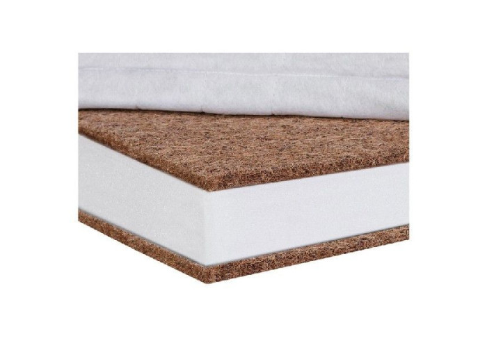 Внутри матрас состоит из 3 слоёв: слоя кокосовой койры, первичного пенополиуретана и еще одного слоя кокосовой койры. Здесь кокосовая койра служит замечательной опорой для позвоночника малыша, является воздухопроницаемой и гипоаллергенной.