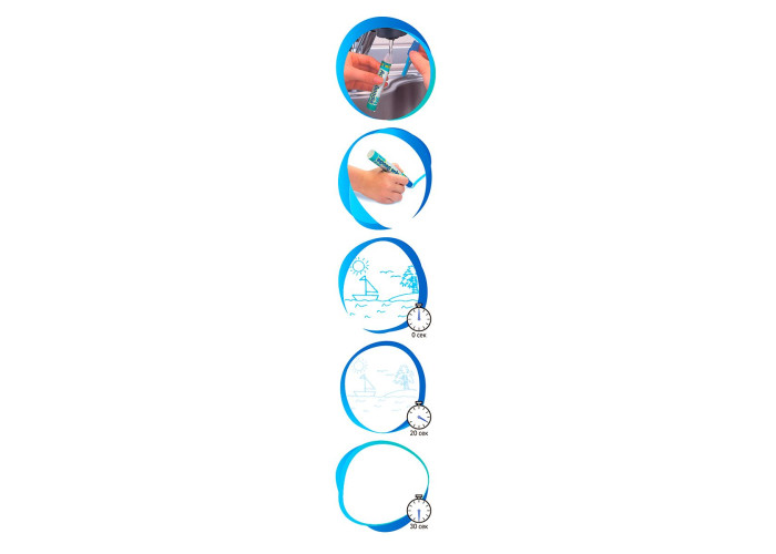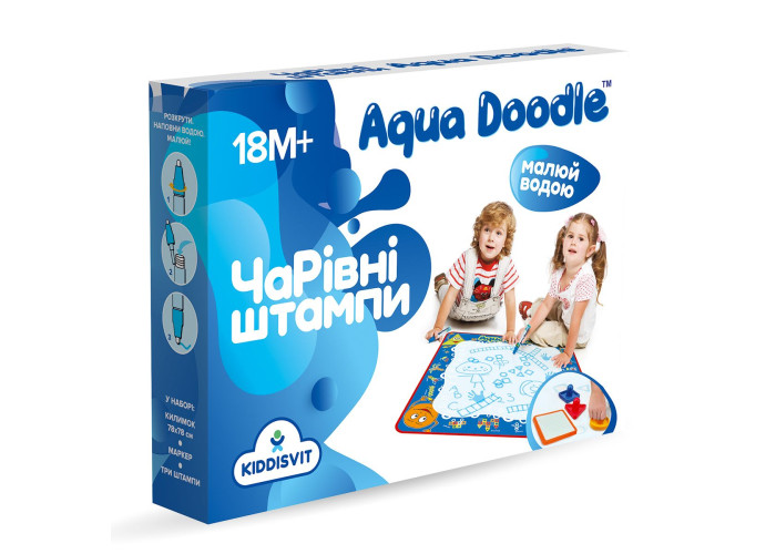 Набір "ЧАРІВНІ ШТАМПИ" - чудовий подарунок для маленького художника. Дитина буде малювати маркером, який наповнюється звичайною водою. Через деякий час малюнки зникають і можна розпочинати малювання знову. Відмінною особливістю набору є його навчальна спрямованість. На килимку розміщені зображення цифр і букв українського алфавіту, які при обведенні маркером стають кольоровими, що допомагає дитині швидко їх вивчити і запам'ятати написання. Уздовж краю килимка розміщені малюнки, що нагадують дитині, як за допомогою штампів у формі різних геометричних фігур можна створювати зображення різних предметів. Кожен малюнок забезпечений підписом українською мовою з назвою зображеного предмета.