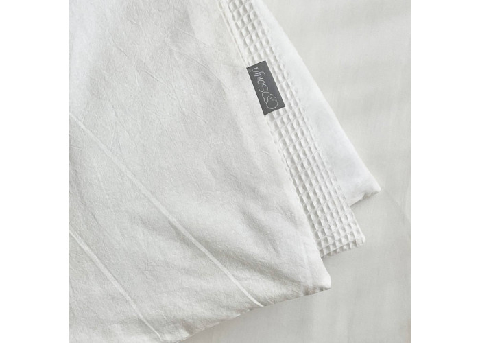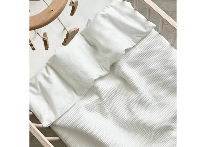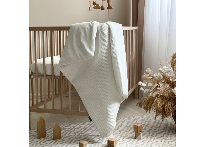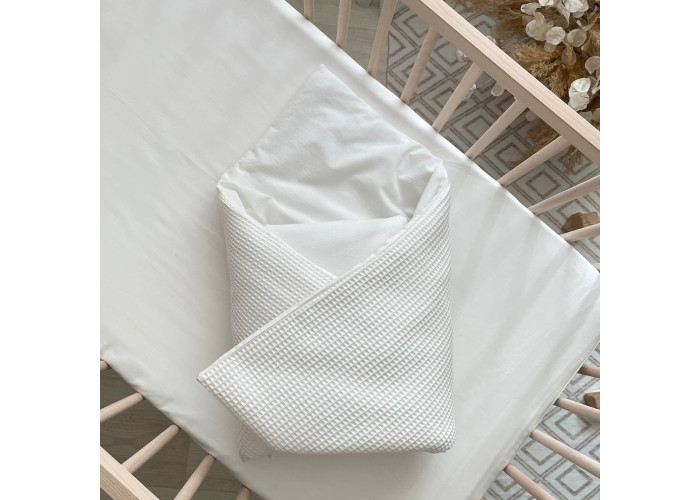 Плед конверт с одеялом - с одной стороны выполнен из вафельной ткани, с другой – из хлопка-жатки. На ощупь рельефное, мягкое и довольно плотное изделие. Такой плед – это отличный вариант для выписки из роддома. Плед можно использовать в детской кроватке, как дополнительное одеяло, укрывать новорожденного в коляске, во время поездки в автомобиле. Благодаря тому, что в изделии съемный утеплитель, этот плед можно использовать в любую погоду.