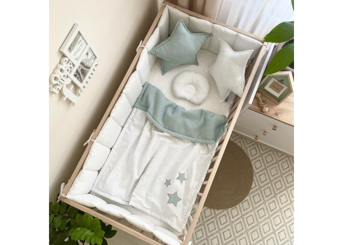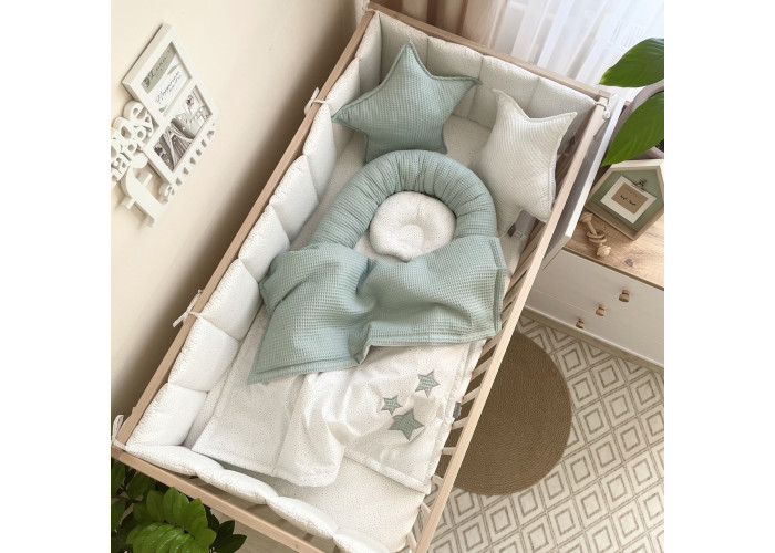 К пледу можно подобрать из коллекции Stars фенс-бортики, кокон, простыню, анатомическую подушку, декоративную подушку "Звездочка" и выйдет полный комплект постельного белья в одном стиле.