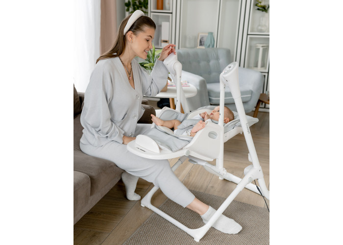 Стульчик для кормления, шезлонг для отдыха и качели с автоматическим бесшумным укачиванием.