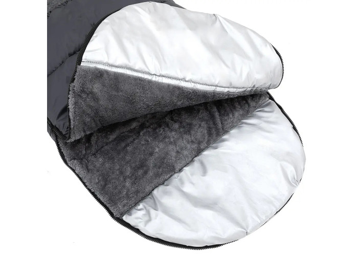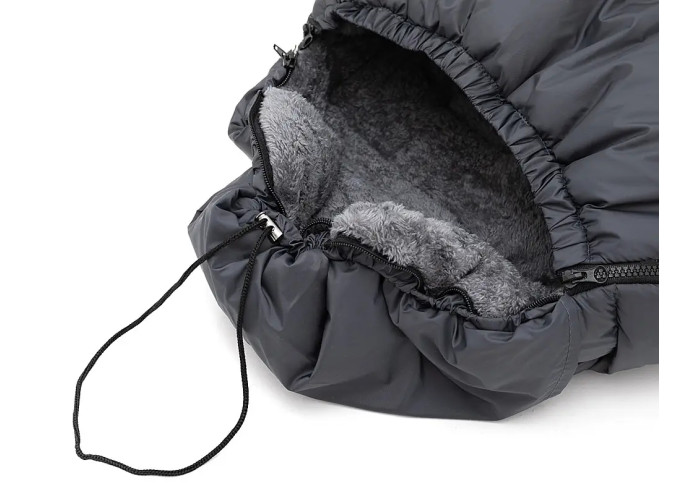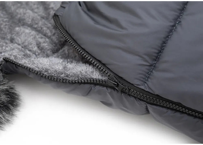 Верхняя часть декорирована съемным, мягким, высококачественным мехом. Сверху конверт можно стянуть в капюшон с помощью специального шнурка, плотно укутывающего голову ребенка для дополнительного комфорта и тепла.
