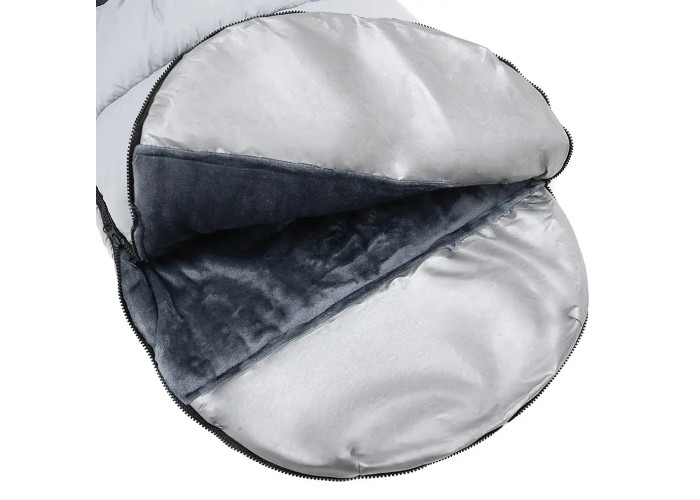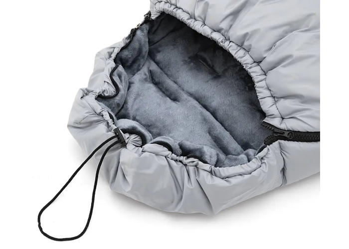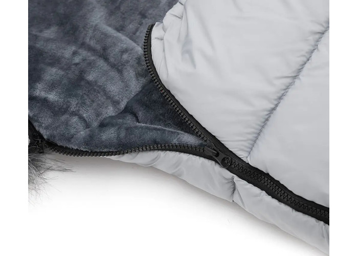 Верхняя часть декорирована съемным, мягким, высококачественным мехом. Сверху конверт можно стянуть в капюшон с помощью специального шнурка, плотно укутывающего голову ребенка для дополнительного комфорта и тепла.